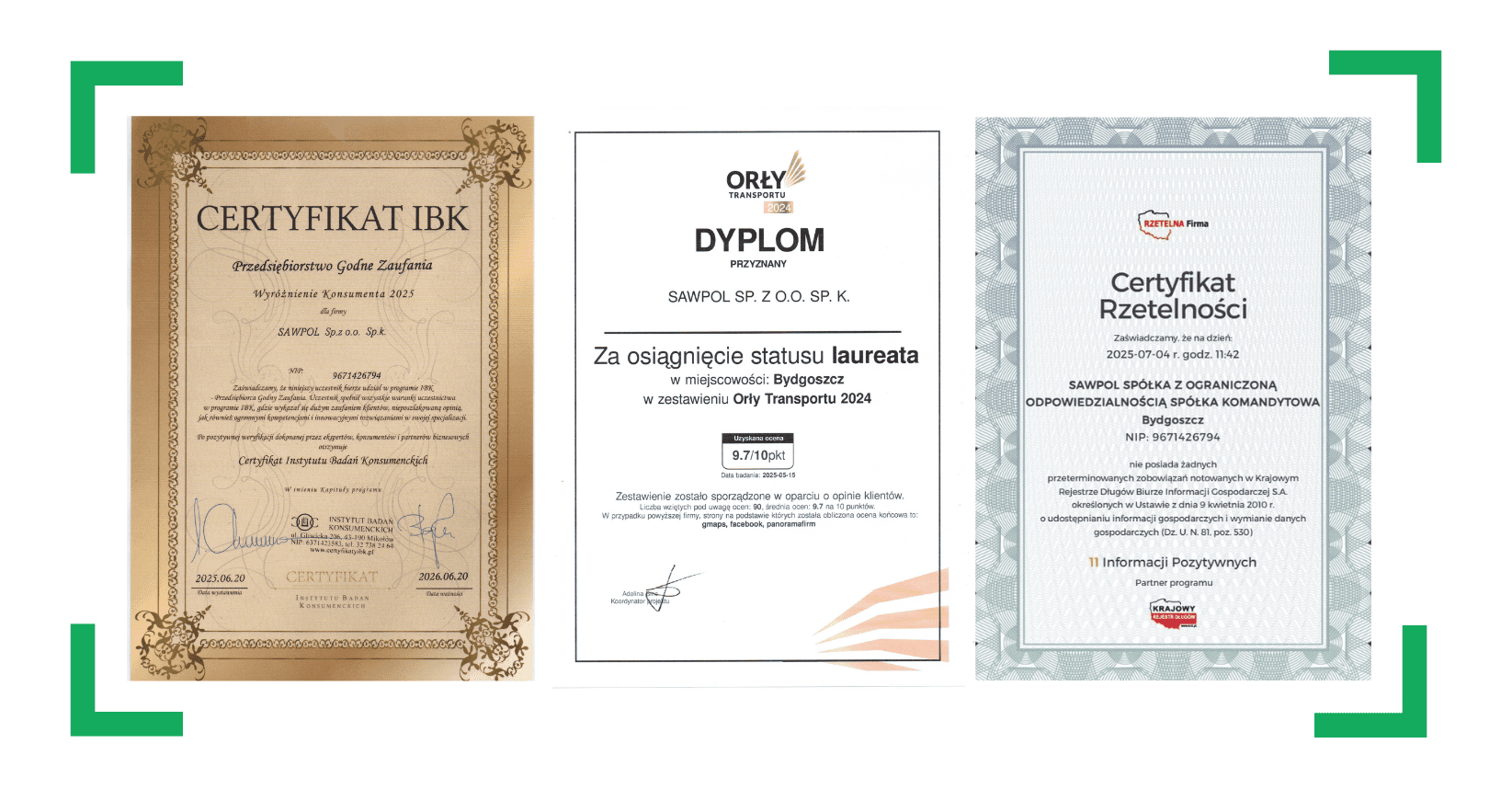 Każdy certyfikat i dyplom, który trafia do SAWPOL, to jednocześnie dowód na wartość, jaką tworzymy – nie tylko dla siebie, ale przede wszystkim dla naszych klientów. "Orły Transportu 2024" to uznanie naszej pasji i profesjonalizmu. Certyfikaty IBK i Rzetelna Firma to przekonanie, że prowadzimy działalność uczciwie, transparentnie i zgodnie z najwyższymi standardami biznesowymi.